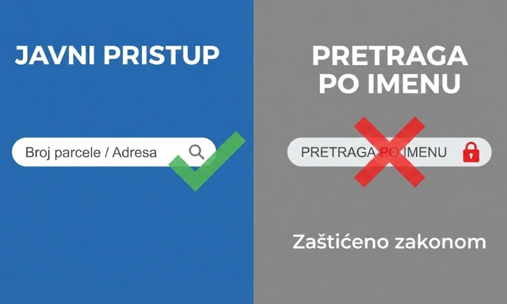 To nije propust, već posledica zakonske obaveze zaštite privatnosti. Javni uvid funkcioniše isključivo po adresi ili parceli, dok je pretraga po imenu rezervisana za profesionalne korisnike i postupke sa pravnim interesom.